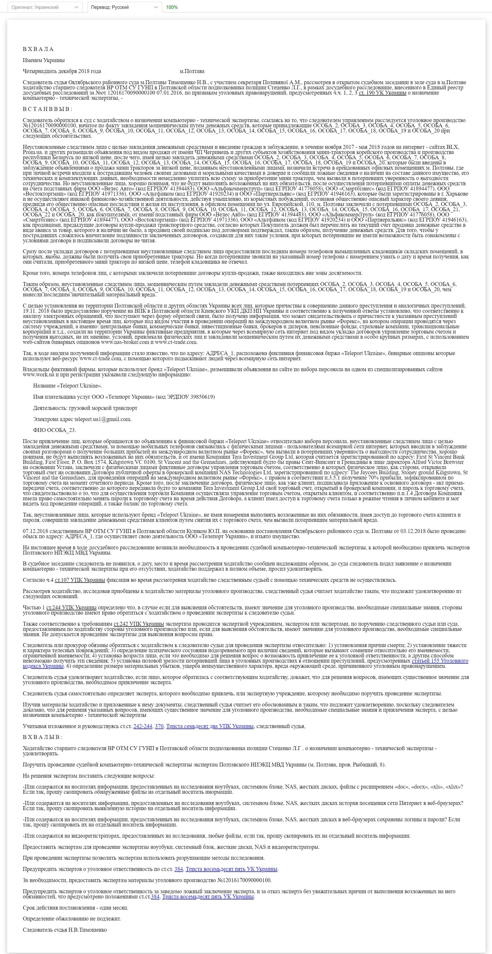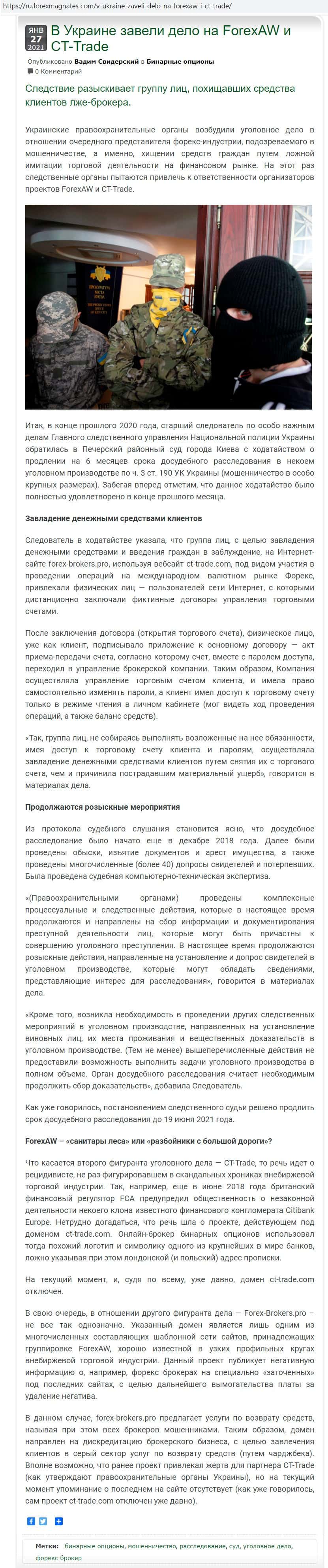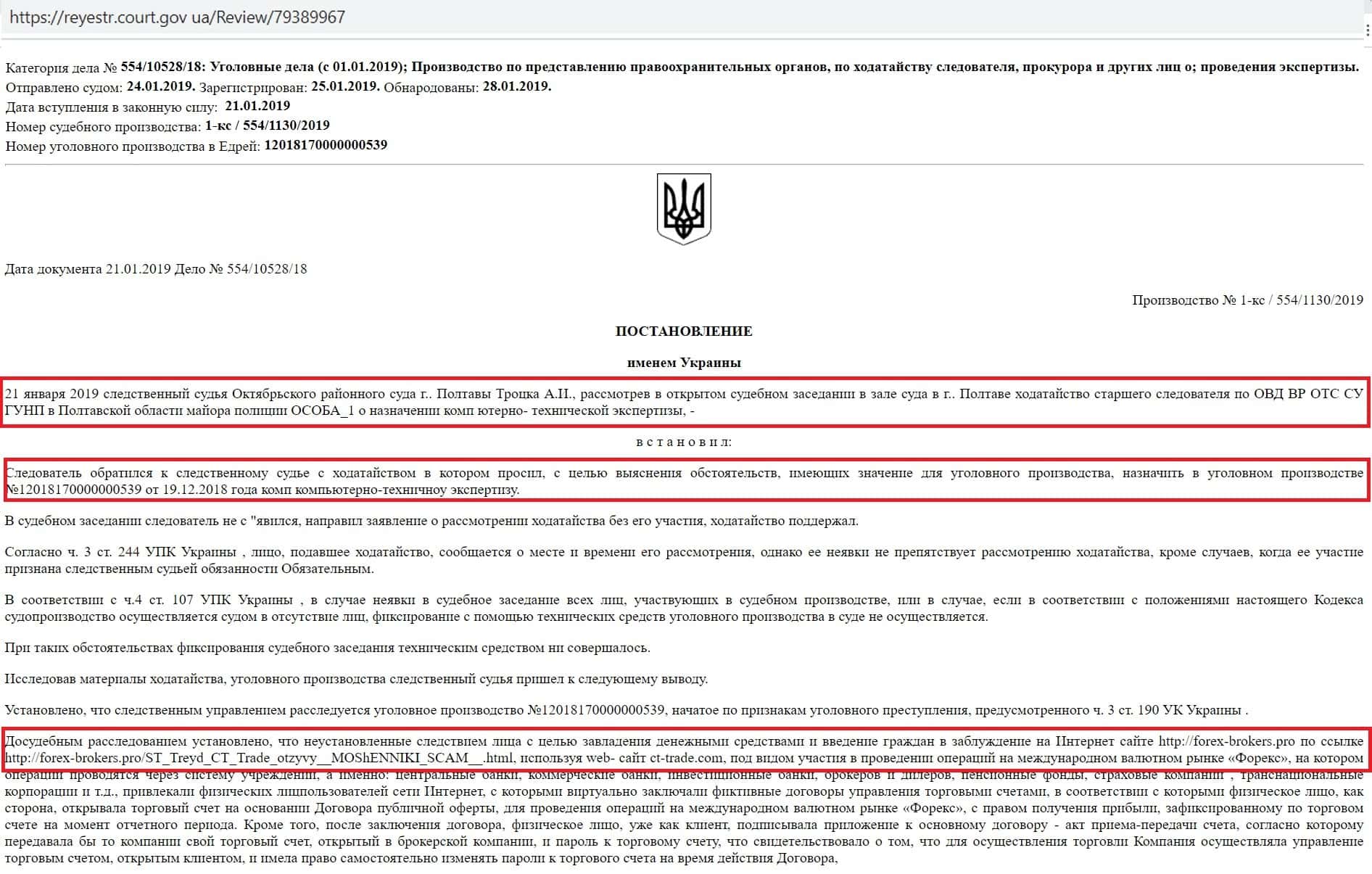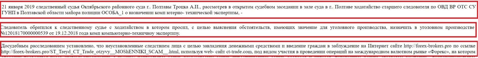 В данном разделе представлена информация об уголовном деле, которое было возбуждено украинскими правоохранителями в отношении CT-Trade, куда попал и forex-brokers.pro. В деле следователь пишет о том, что через данную страницу привлекались клиенты в онлайн-аферу CT-Trade. Информация взята с ForexMagnates Com (Форекс Магнатс).