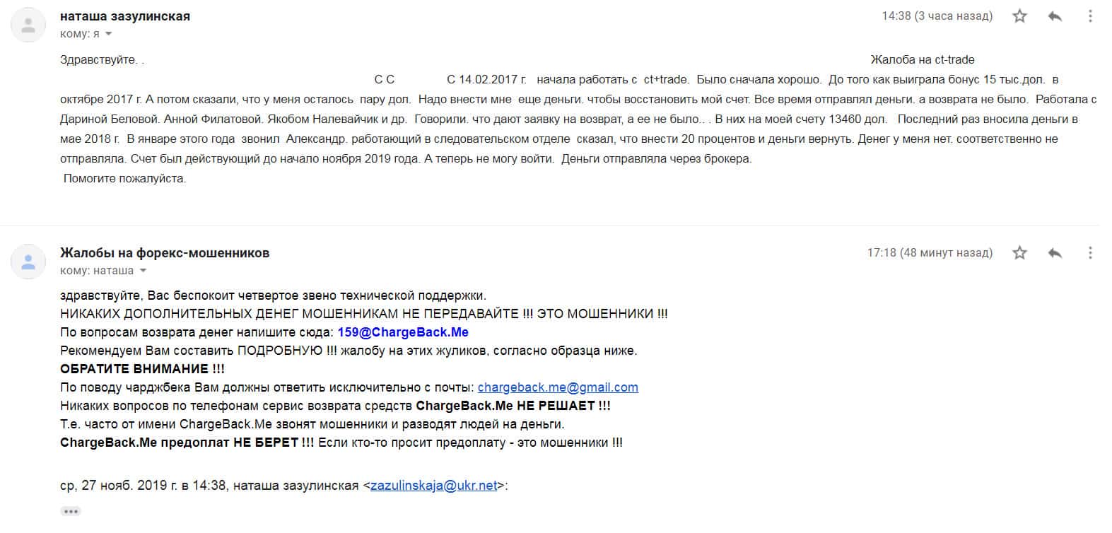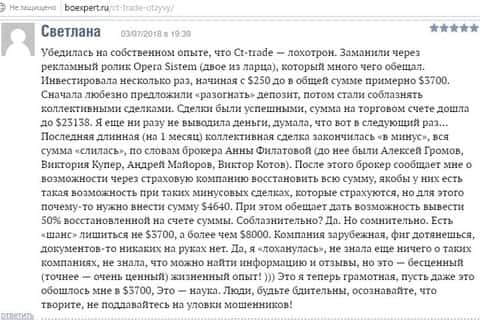 Автор последующего информационного материала сообщила о том, что стала жертвой мошенничества конторы CT-Trade, а всем потом что данная организация является фальшивым брокером, работающим лишь на ввод клиентских денежных средств.
