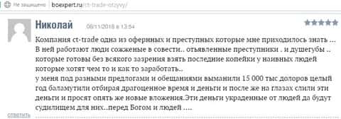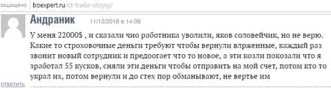 Мошенники дилинговой форекс-кухни СТ-Трейд однажды развели человека на 250 долларов. Когда он искал в интернете отзывы о данной конторе, естественно после того как она опрокинула его, он нашел нашу статью и решил написать нам жалобу. Он надеялся, что жулье его не обманывает и будет все как он говорил. Слова о том, что можно будет вернуть депозит в любой момент очень внушила доверие. Но это были лишь слова и ситуация закончилась уже для всех известным итогом - шулера конторы CT-Trade не отдали ни копейки.