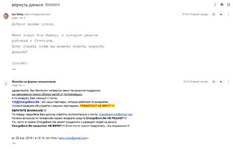 Еще один случай произошел с человеком, который доверился аферистам СТ-Трейд. Мошенники сначала выманили 250 долларов, а потом стали просить еще 1000 долларов, якобы для обучения. По совету друга, человек теперь обратится в компанию ChargeBack.Me где возможно порешать вопрос.