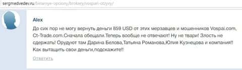 Эти бинарные брокеры стали наглее форекс-лохотронов. Это видно из того, что конторщики из дилинговой кухни Vospari и CT-Trade заманили человека и отобрали у него целых 859 долларов США. Мерзавцы работают сообща, поэтому им легко было запутать клиенту мозги и расправится с ним как следует. Что Форекс, что бинарные опционы - все одно и тоже, название только разные. И главное, что их объединяет - это подстроенный лохотрон с итогом на слив денег клиента. Вот такие мошенники работают в данных кухнях: Дарина Белова, Татьяна Романова, Юлия Кузнецова и многие другие твари. Так что если вдруг услышали такие имена, то сразу же бегите или бросайте трубку - они желают забрать у вас все деньги.