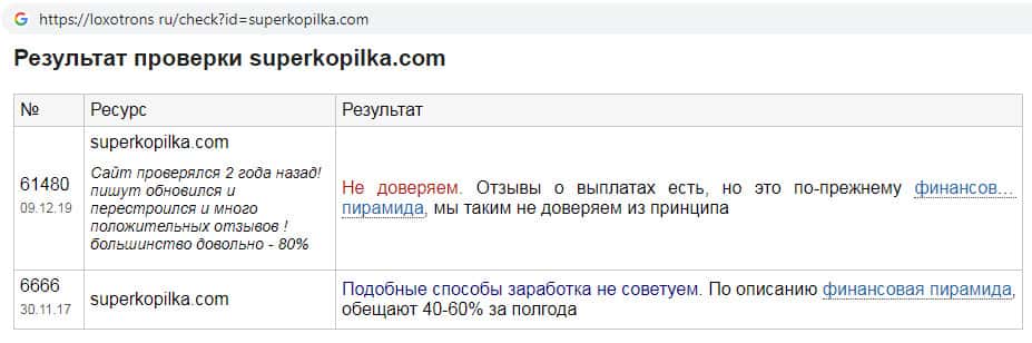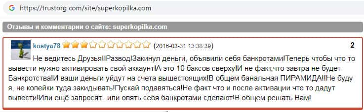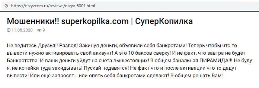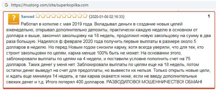 На онлайн-ресурсе trustorg com расположен отзыв о жульнической конторе Супер Копилка. Автор данного комментария пишет, что достаточно долгое время получал выплаты, но сразу же после того как появилась значительная сумма на счете, мошенники заблокировали его счет. В итоге автор отзыва потерял 400 долларов. Верить шулерам SuperKopilka нельзя !!!