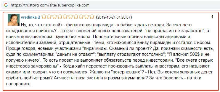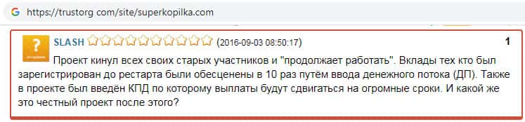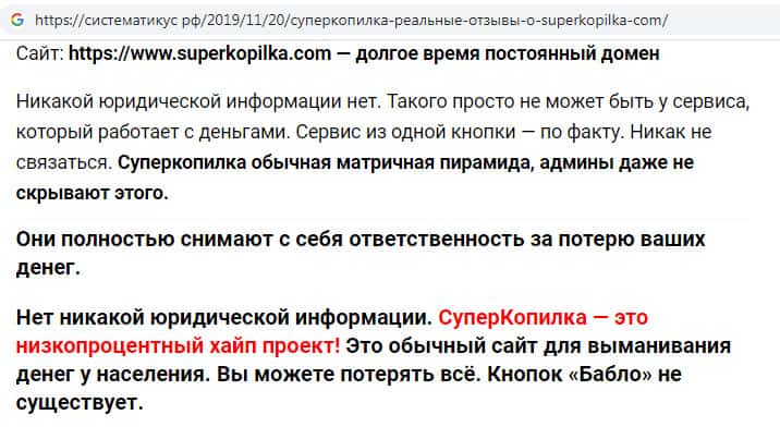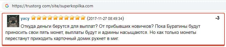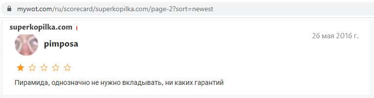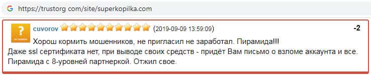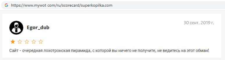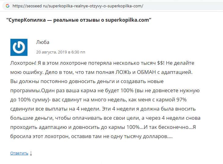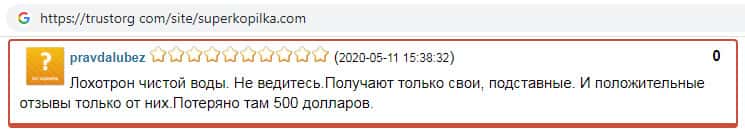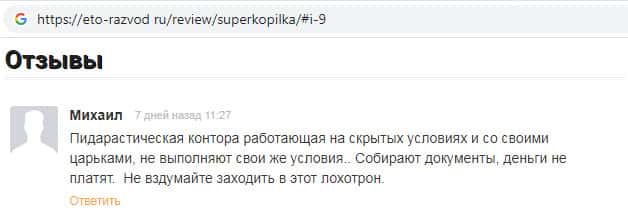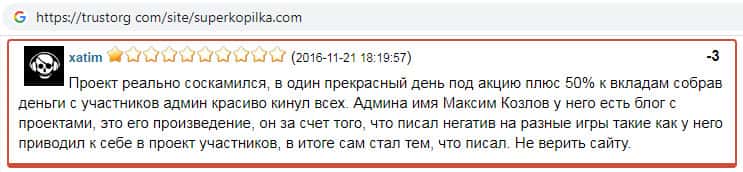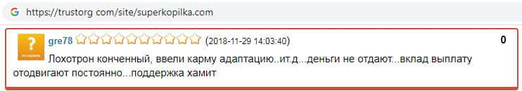 На веб-портале трусторг ком отыскан отзыв о мошеннической организации SuperKopilka, автор которого пишет, что повелся на этот лохотрон и не смог вернуть свои деньги обратно по той причине, что жулики постоянно меняют сроки выплат. Техническая поддержка сайта не умеет разговаривать с теми клиентами, у которых не получается вывести свои средства.
