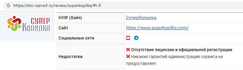 - Отсутствие информации о лицензировании скам-компании SuperKopilka