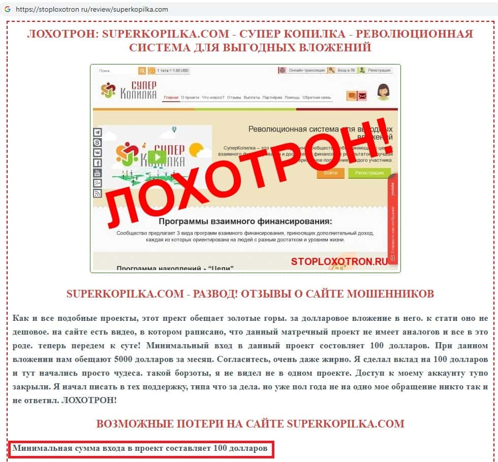 - Минимальная сумма инвестиций на сайте скам-конторы Супер Копилка составляет 100 долларов