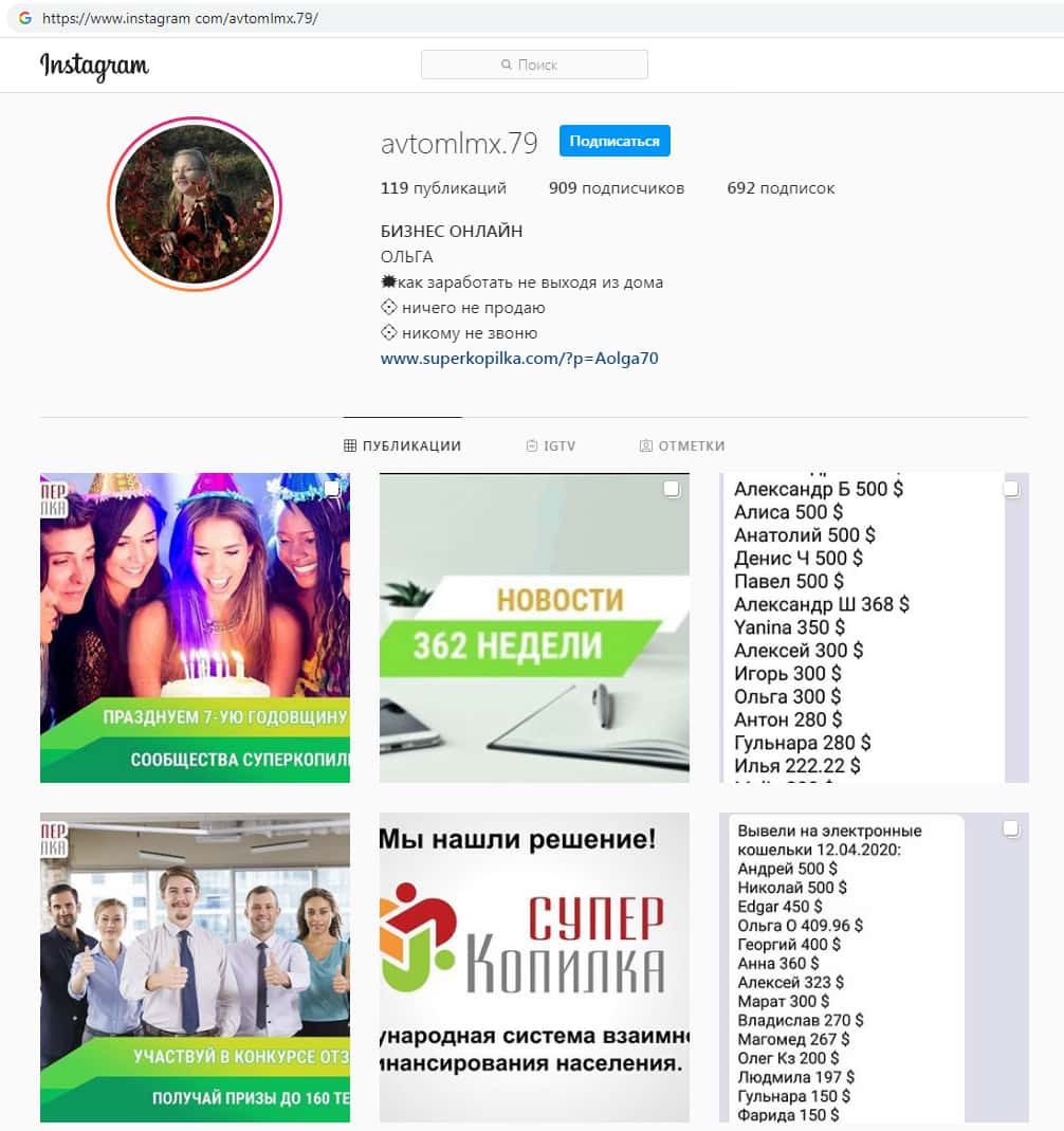 Аферисты Супер Копилка зарегистрировались на сайте instagram com, где размещают много информации о якобы бизнесе онлайн, а так же опубликовывают очень много изображений, которые мотивируют пользователей регистрироваться на их дырявом сайте и инвестировать. Не связывайтесь с мошенниками SuperKopilka !!!