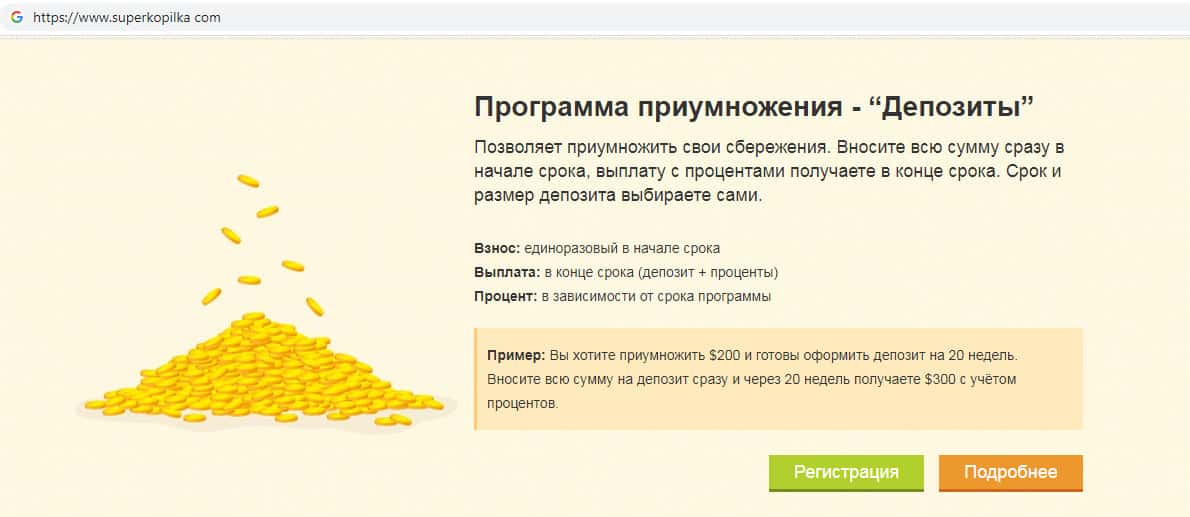 Здесь аферисты SuperKopilka обещают возможность приумножения депозита якобы за счет того, что на пользовательском счету будет необходимая для этого сумма денежных средств. Минимальная сумма депозита составляет 200 долларов. Но даже выполнив все условия велика вероятность потери всех своих вложенных денежных средств.