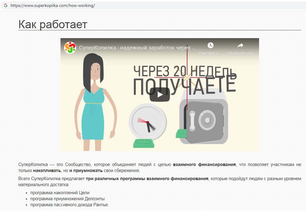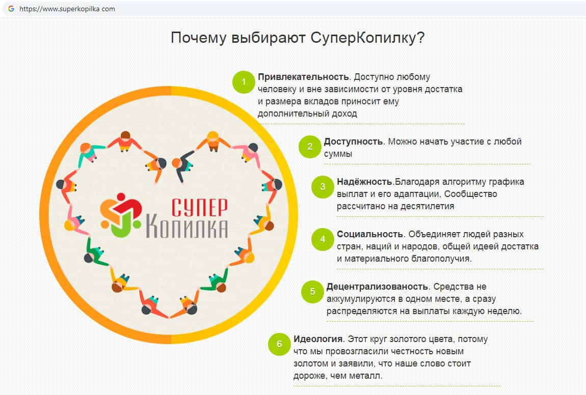 В действительности Супер Копилка не является серьезной компанией. Это очередной интернет-ресурс, который собирает денежные средства со своих клиентов под предлогом того, что их контора якобы объединяет людей с целью взаимного финансирования. То есть шарага SuperKopilka забирает деньги у одного пользователя и отдает другому.
