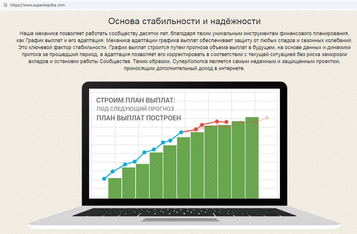 Жулики SuperKopilka для того, чтобы создать видимость надежности своей компании, разместили изображения с графиками плана выплат денежных средств. Мошенники Супер Копилка таким образом вовлекают лохов на свой дырявый сайт, наживаясь таким образом на людях. Не инвестируйте свои денежные средства на сайте данной скам-конторы !!!
