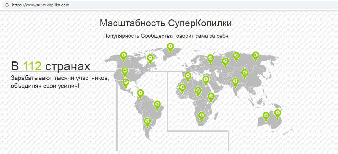 Скам-организация SuperKopilka на своем официальном сайте опубликовала статистические данные о якобы настоящих показателях сайта, а о том, что их компания якобы дает возможность получения заработка в 112 странах мира. Не связывайтесь с лжецами Супер Копилка, поскольку обманывают пользователей своего сайта не зависимо от того, где он проживает !!!