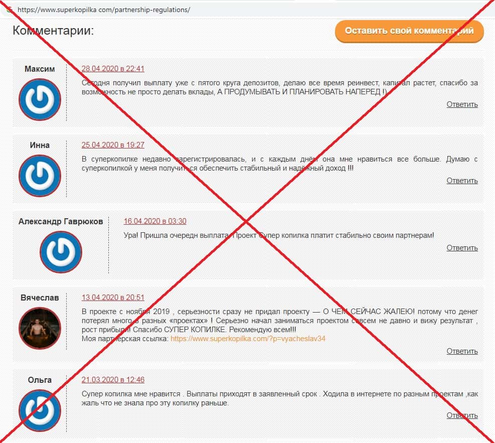 - Положительные отзывы о скам-конторе Супер Копилка пишут сами администраторы их фейкового сайта
