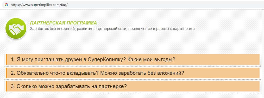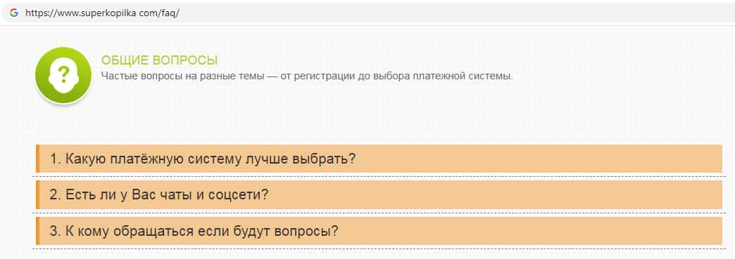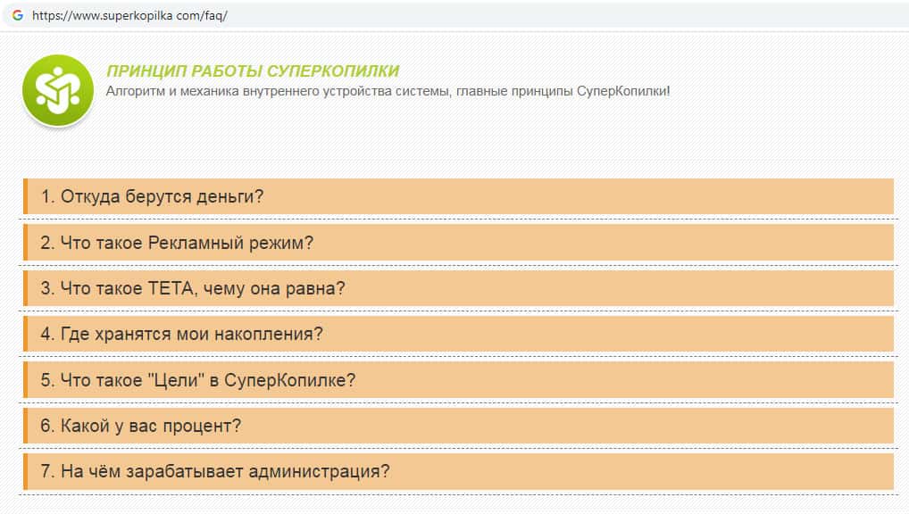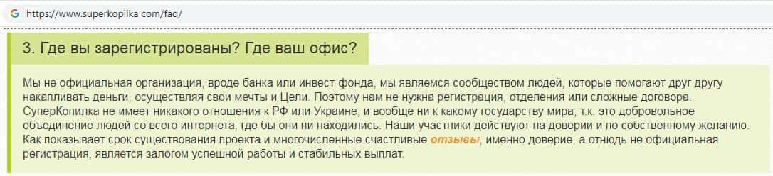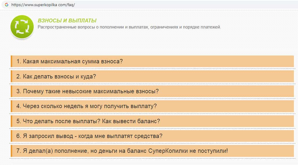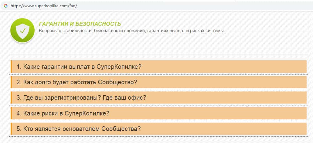Жулики SuperKopilka подстраховались и для того, чтобы втереться в доверие людям, притворяясь честной компанией, опубликовали вопросы о выплатах средств, возможных рисках потери денежных средств. При этом нет никакой гарантии того, что Вам удастся получить хотя бы первоначальную выплату.
