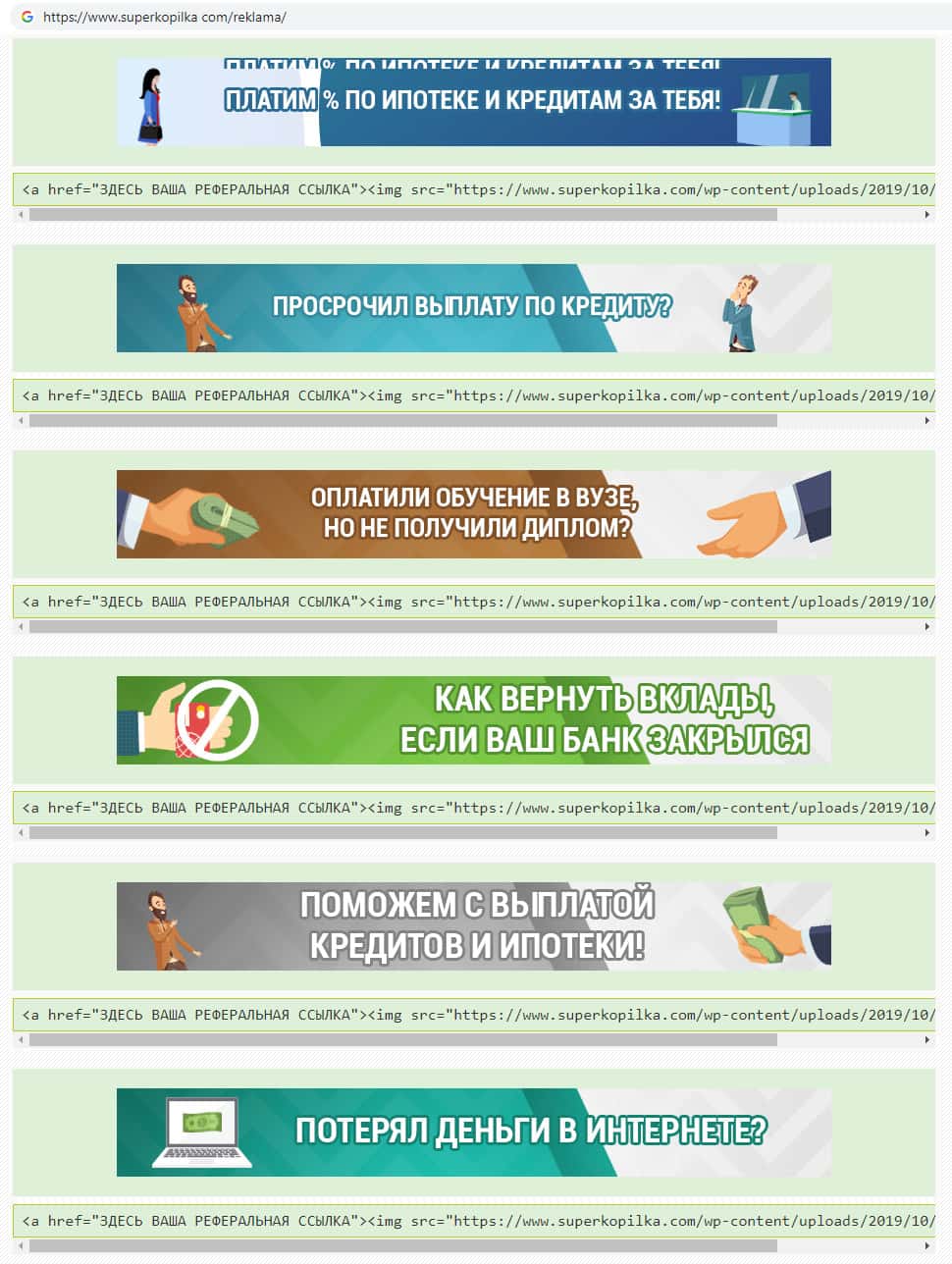 Представители шараги Супер Копилка во всемирной паутине распространяют рекламную информацию о своей компании, которая мотивирует пользователей регистрироваться на их дырявом сайте. Аферисты SuperKopilka предлагают воспользоваться услугами их компании именно тем людям, у кого уже есть определенная задолженность.