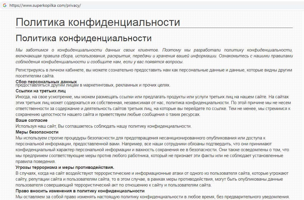 - Политика конфиденциальности на сайте скам-организации SuperKopilka