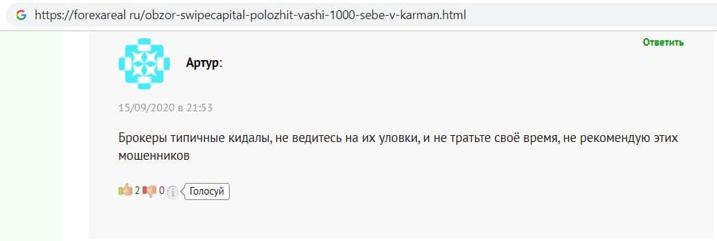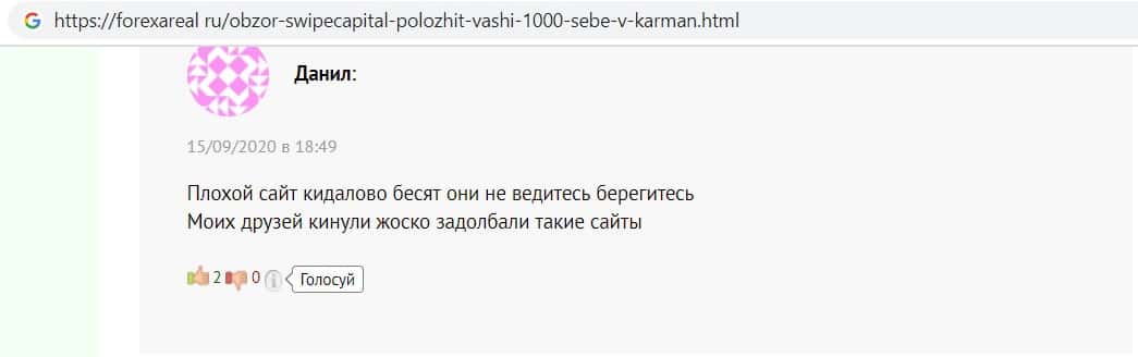 Ещё мы наткнулись на сайт forexareal ru, который так же сделал обзор конторы Свайп Капитал, и сообщил, что это аферисты, которые только развиваются в сфере мошенничества.