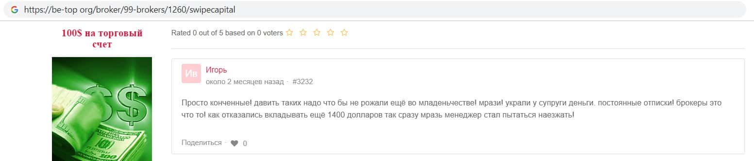 Ещё сайт be-top org посоветовал интернет пользователям, которые ищут заработок в интернете не связываться с SwipeCapital io, так как компания является полным лохотроном.