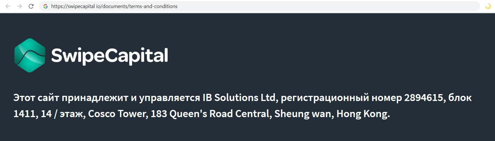 Компания финансовых разводил Свайп Капитал на своём главном интернет ресурсе указала, что осуществляет свою деятельность от имени компании IB Solutions Ltd.