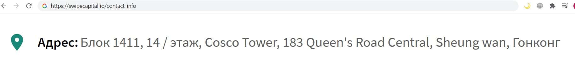 Так же фирма махинаторов Свайп Капитал указала адрес главного офиса. Но вот только эта информация липовая, так как никто не сможет проверить его существование. Адрес кидал: