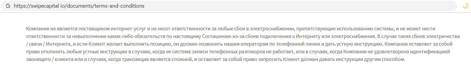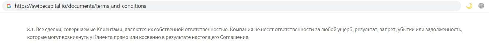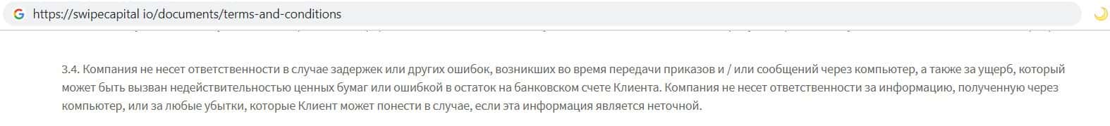 Так же финансовый лохотрон Свайп Капитал отказался от ответственности за любые убытки клиентов, которые тот может понести в случае сотрудничества с данной компанией.
