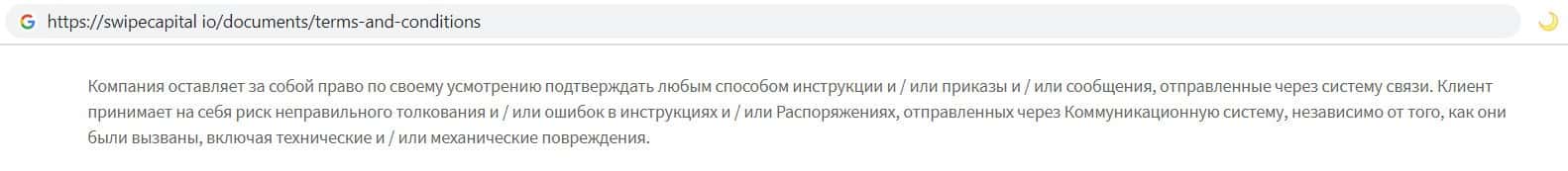 Ещё аферисты SwipeCapital io указали, что будут отправлять клиентам инструкции, но при этом указала, что не отвечают за то, что клиент не правильно поймёт их трактование.