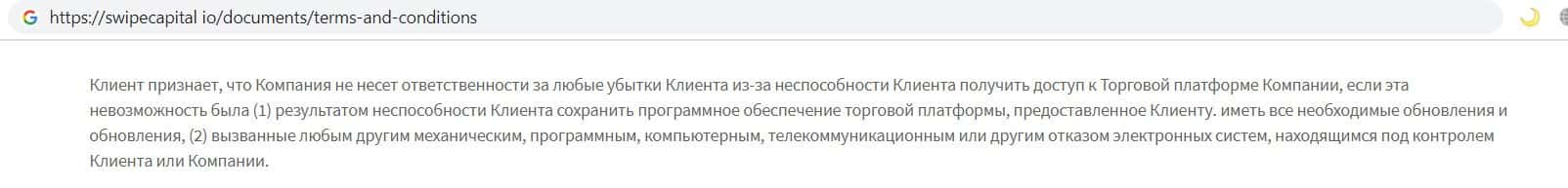 А в данном пункте компания финансовых кидал SwipeCapital io указала, что не будет отвечать за убытки клиента из за того, что тот не может получить доступ к их сервису.