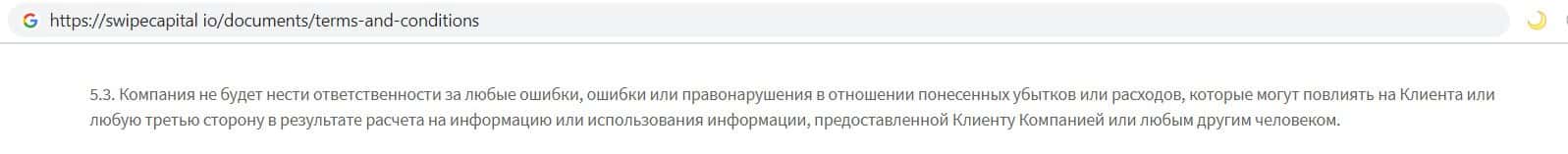 Фирма жуликов Свайп Капитал так же указала, что не несёт ответственности за убытки клиентов из за неточности информации, которую компания получает через интернет.