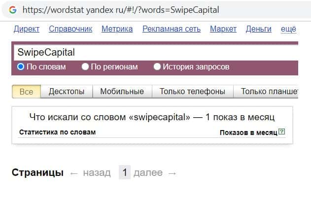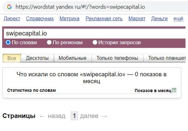 Мы проверили количество запросов мошенников SwipeCapital io в Яндексе по названию фирмы, а именно "SwipeCapital". Всего 1 раз пользователи совершали данный запрос за месяц.