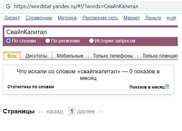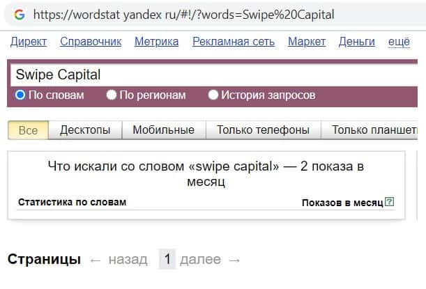 Ещё мы решили проверить количество запросов кидал SwipeCapital io по русскоязычному названию фирмы. а именно "Свайп Капитал". Но результат оказался нулевым и здесь.