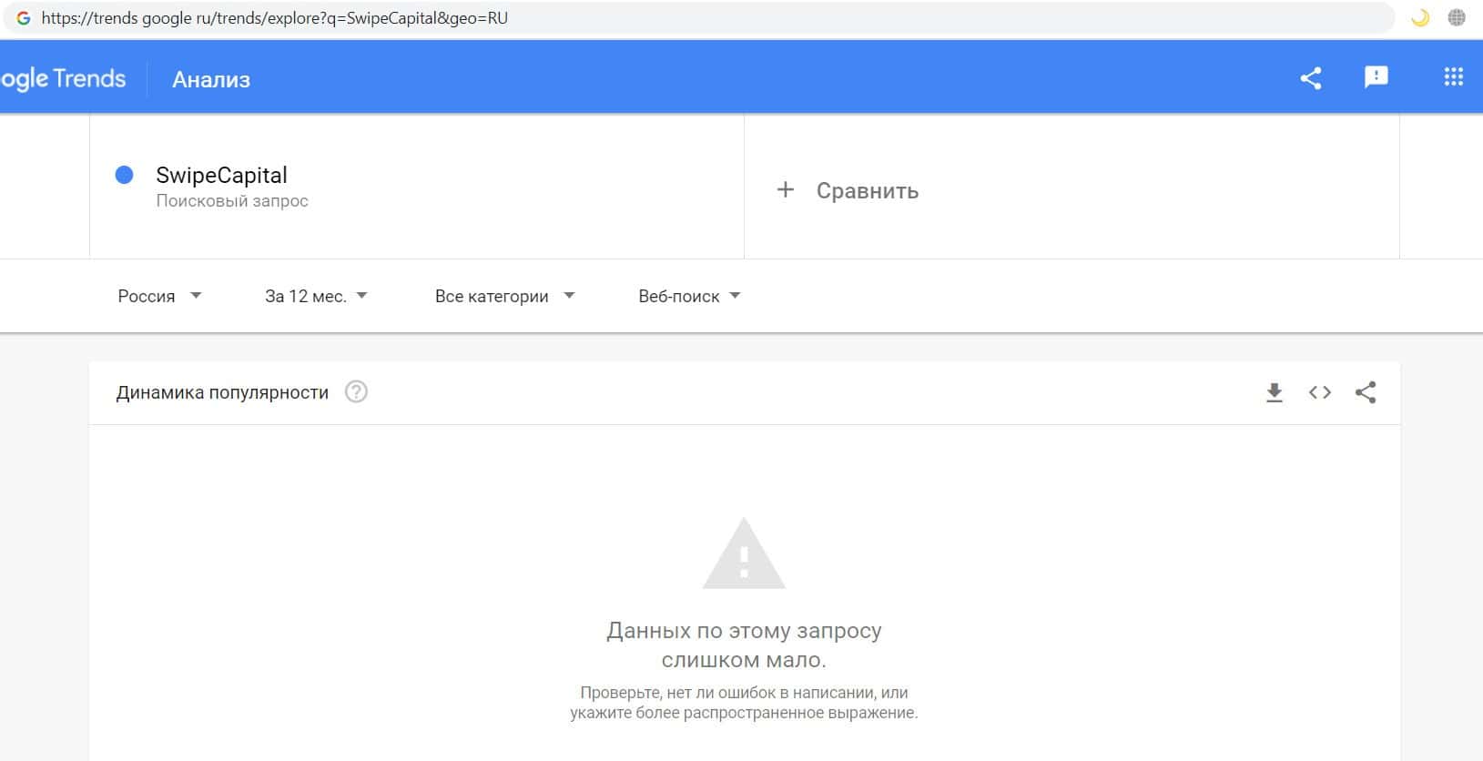 Проверить мы решили и количество запросов конторы аферистов SwipeCapital io по русскоязычному названию, а именно "Свайп Капитал". Но никто не совершал этот запрос.