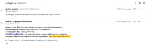 Письмо пришло от человека, который имел неосторожность связаться с лохотроном Сварга. Жулики взяли на вооружение теплые и сказочные слова о богатстве, которые умилили душу клиента. Он, под воздействием со стороны мошенников, перевел две суммы в размере 135 долларов и 500 долларов. Таким образом был сформирован счет для торговли. Торговля шла относительно нормально, поэтому клиент захотел вывести 150 долларов. Но позвонил трейдер-аналитик из ДЦ Svarga и сообщил, что для вывода нужно чтобы на счету было 2000 долларов. По итогу, клиент не повелся на эти уловки, а написал письмо в сервис ChargeBack.Me где уже занимаются данным вопросом.