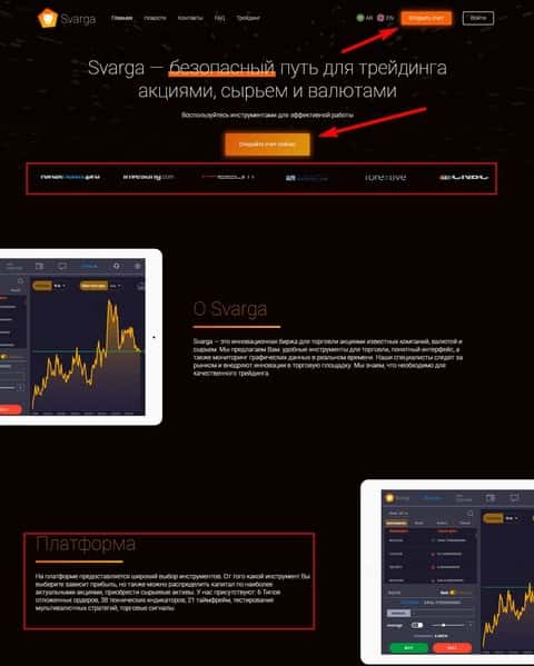 Если посмотреть сайт дилинговой кухни Svarga, то здесь можно отметить, в первую очередь, раскиданные кнопки открытием счета, которые покоя не дают. Дальше мошенники ссылаются на авторитетные финансово-информационные ресурсы, которые знать не знают о существовании кухонного брокера Сварга. Ну и конечно же аферисты не пожалели денег и создали свою торговую платформу с кучей багов и недоработок. Вряд ли можно доверять данной программе, тем более что контора Svarga имеет полный контроль.