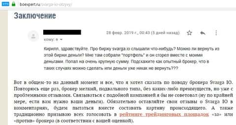 Не одни только мы замечаем косяки, которые создала сама для себя форекс-контора Сварга. Вот на один ресурс под названием Boexpert, пришло письмо от человек, которого уже опрокинули мошенники из организации Svarga. Поэтому, как гласит вывод обзорной статьи, это брокер подвального типа, без каких-либо преимуществ, и который имеет уже проблемные отзывы. Согласно вынесенному вердикту, не стоит связываться с аферистами Сварга, иначе будут проблемы.