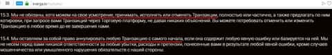А вот в следующих пунктах Клиентского соглашения вскрываются частично кухонные методы аферистов Svarga, которые они используют в своих корыстных целях. Согласно пунктов 15.3 и 15.4 аферисты могут на свое усмотрение принимать, исполнять или отменять транзакции, а также имеют право аннулировать транзакцию. Вот тебе и "демократия". Здесь конечно у клиента доказать свою правоту нет.