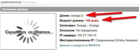 А вот теперь вишенка на торте по поводу разоблачения работы дилинговой кухни Сварга. На сайте аферисты указали, что работают успешно уже 3 года и мы решили проверить данную информацию. Используя сайт довериевсети рф, мы пробили домен ресурса конторы Svarga. Как оказалось, на момент написания данной статьи возраст домена составлял 146 дней. Так что это уже является обманом и 30 000 клиентов за такой период ну никак не клеится.