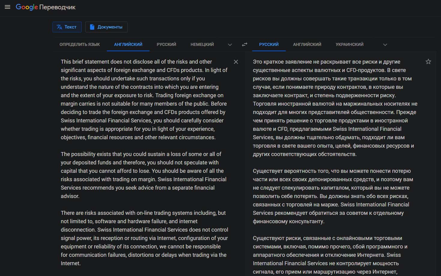 Несмотря на всеобщую пафосность сайта лохотрона Swiss International, жулики все же не удосужились предоставить нормальных условий сотрудничества или же политики конфиденциальности. Вместо этого на сайте у мошенников Швис Интернейшнл присутствует банальное предупреждение о рисках сотрудничества с проходимцами Swiss International.