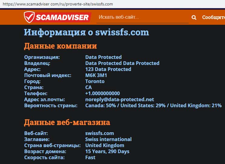 В связи с мошеннической и противозаконной деятельностью лохотрона Swiss International его реальные руководители предпочитают анонимность дабы избежать ответственности со стороны правоохранительных органов. Техническую же информацию о сайте жулья Швис Интернейшнл можно узнать с помощью портала scamadviser com, что вы можете увидеть ниже.