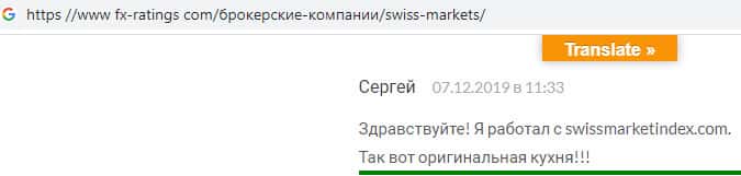 На нижеуказанном скриншоте бывший форекс трейдер сообщил, что сотрудничал, к своему великому сожалению, с дилинговой конторой SwissMarketIndex. В своем отзыве он назвал данную брокерскую компанию обыкновенной форекс кухней, с которой нельзя ни в коем случае связываться и лучше обходить подальше, чтобы не потерять свои же средства.