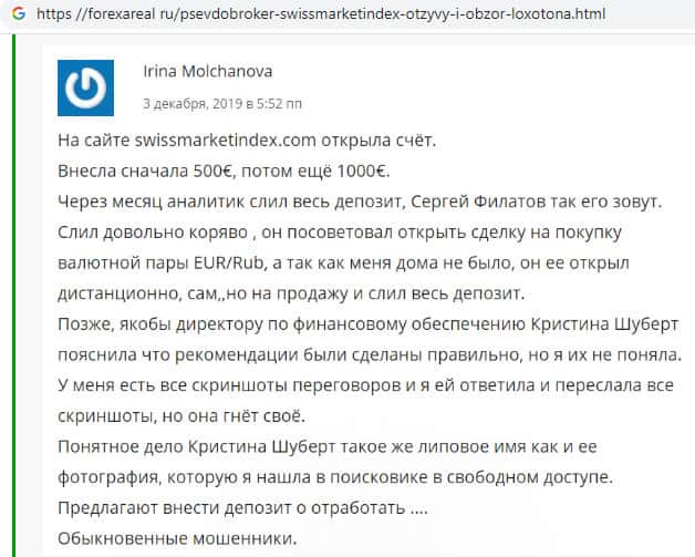 На нижевыставленном скриншоте, Вы можете воочию ознакомиться с еще одним негодующим отзывов обманутого форекс трейдера по поводу того, что работники лжеброкера SwissMarketIndex хорошо обучены втягивать новых клиентов, чтобы потом их кинуть. В итоге, мужчина без своих денег, а назад так и не смог до сих пор их вернуть.