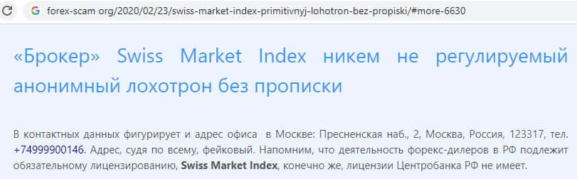 По факту, так называемый биржевой брокер Свисс Маркет Индекс является никем не регулируемым анонимным лохотроном без прописки, поскольку адрес, указанный в России, является фейковым. Лицензии Центробанка РФ данная шарага также не обладает, тем самым нарушая российское законодательство. Лохотрон и развод, одним словом.