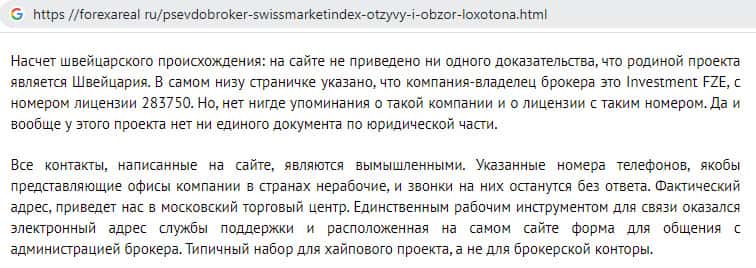 Ненадежный и претензионный брокер SwissMarketIndex по мнению веб-сайта forexareal ru