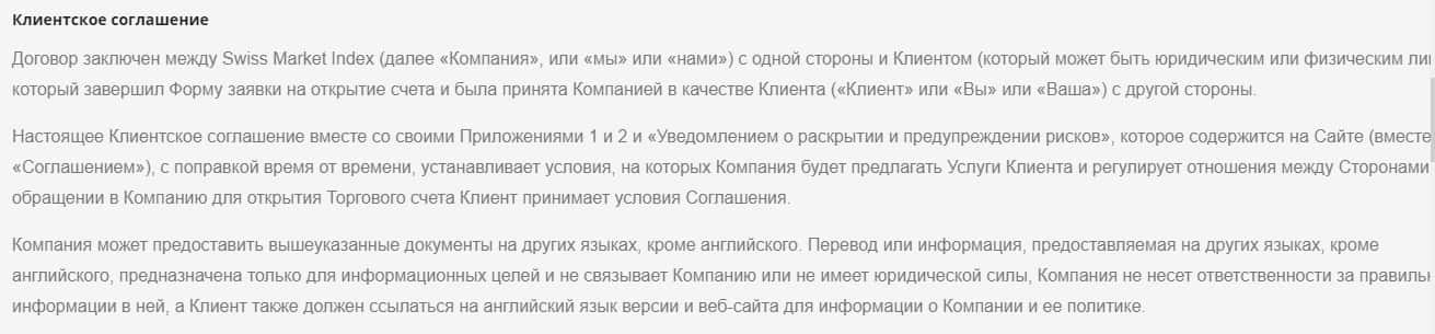 Клиентское соглашение с аферной организацией SwissMarketIndex поражает биржевых трейдеров изначально, говоря о том, что перевод, предоставляемый на других языках, кроме английского, предназначен лишь для информационных целей и не связывает этих ворюг ни с чем. В итоге, форекс брокер не несет ответственности за правильность информации в ней.