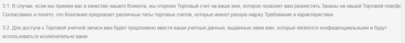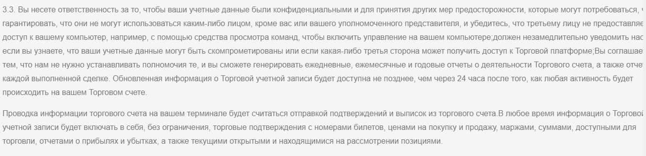 Далее весьма занимательными являются пункты 3.1. и 3.2. соглашения, в которых упоминается о том, что для доступа к торговой учетной записи клиент должен будет ввести свои учетные данные, которые являются конфиденциальными и будут использоваться исключительно ним же. Но при этом, непонятно, каковы есть гарантии со стороны брокера для их сохранности.