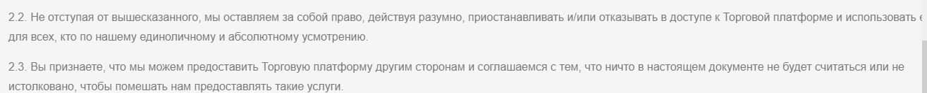 Пункт 2.2. договора повествует о том, что руководство шулерского форекс брокера SwissMarketIndex оставляет за собой право, действуя разумно, приостанавливать или даже отказывать в доступе к торговой платформе и использовать ее для всех, кто по их абсолютному усмотрению этого достоин. Одним словом, разводняк и лохотрон на лицо.