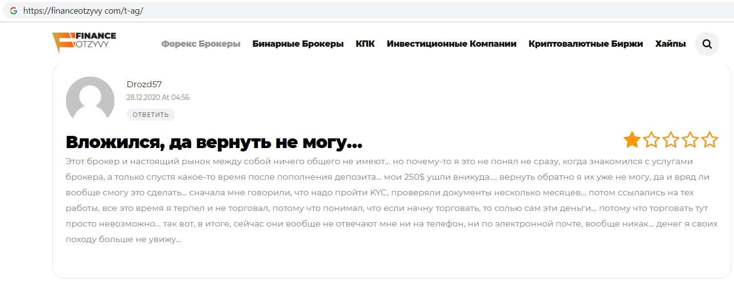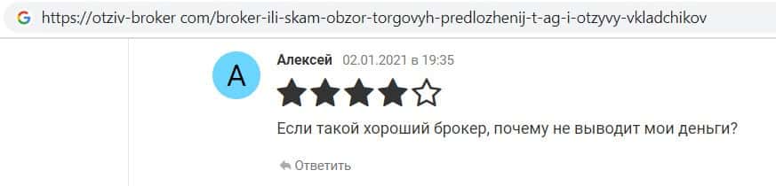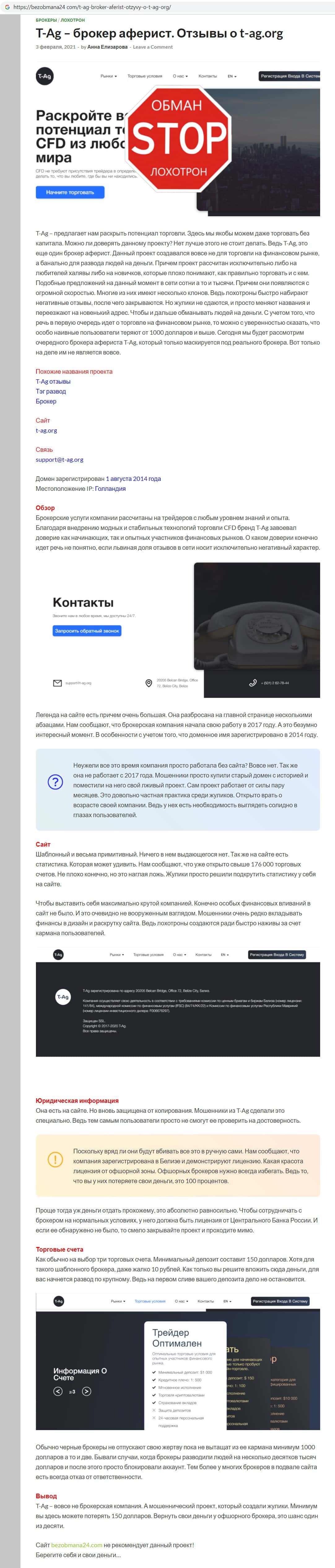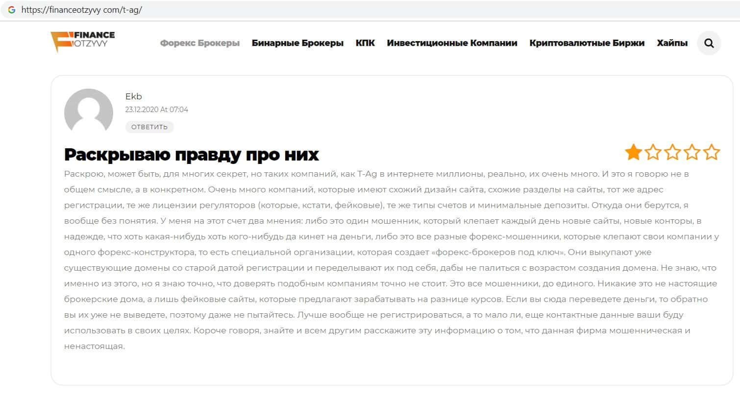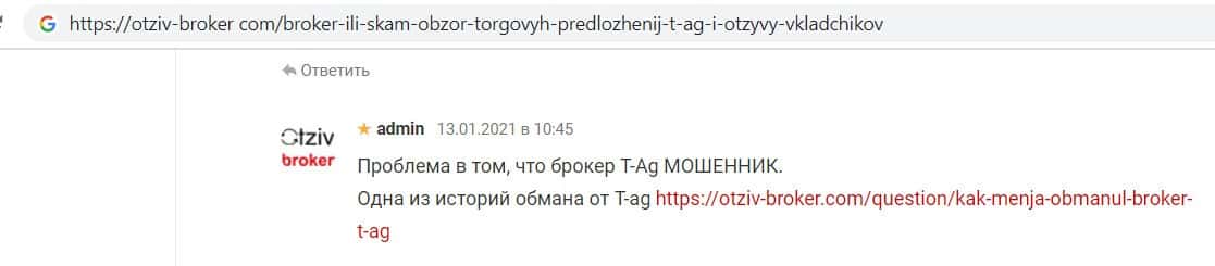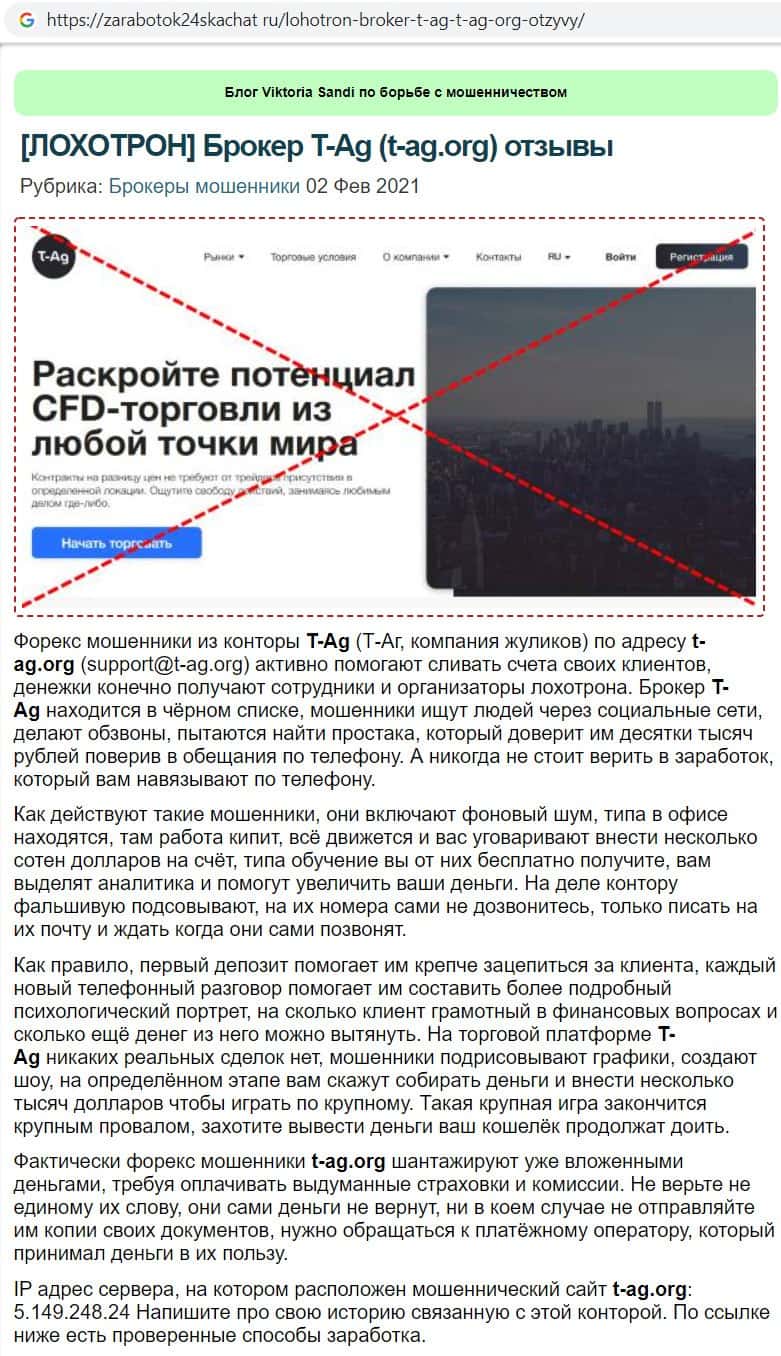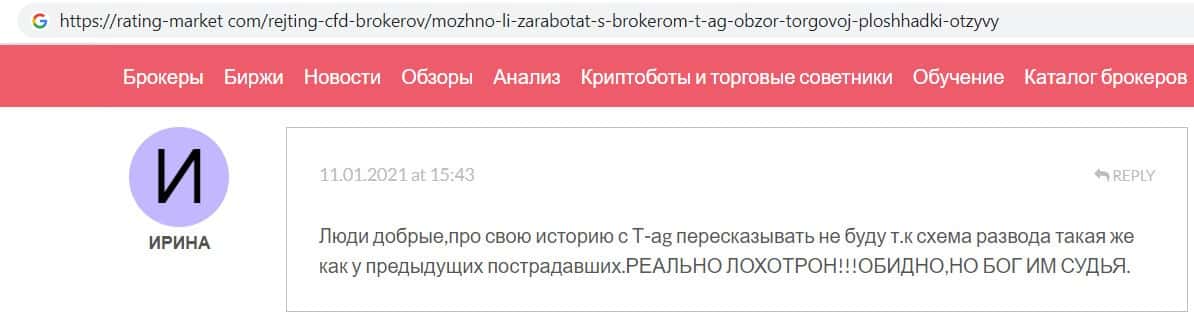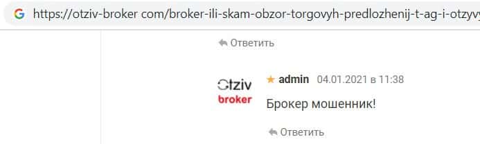 В поисках информации о Т АГ мы наткнулись на сайт bezobmana24 com, который указал, что данная контора не является брокером, а это всего лишь мошеннический проект.