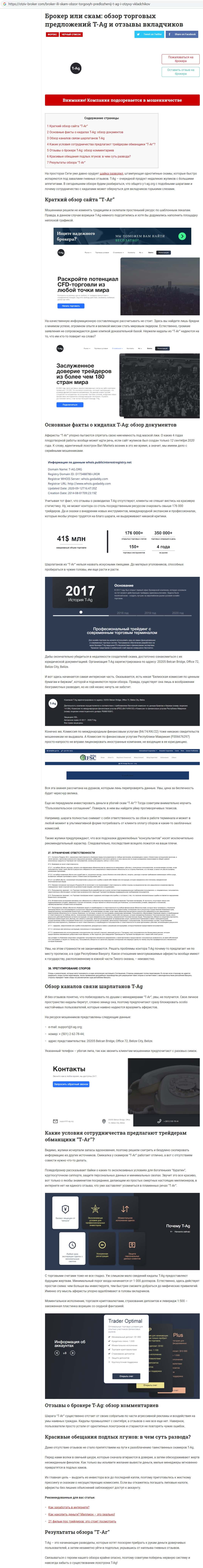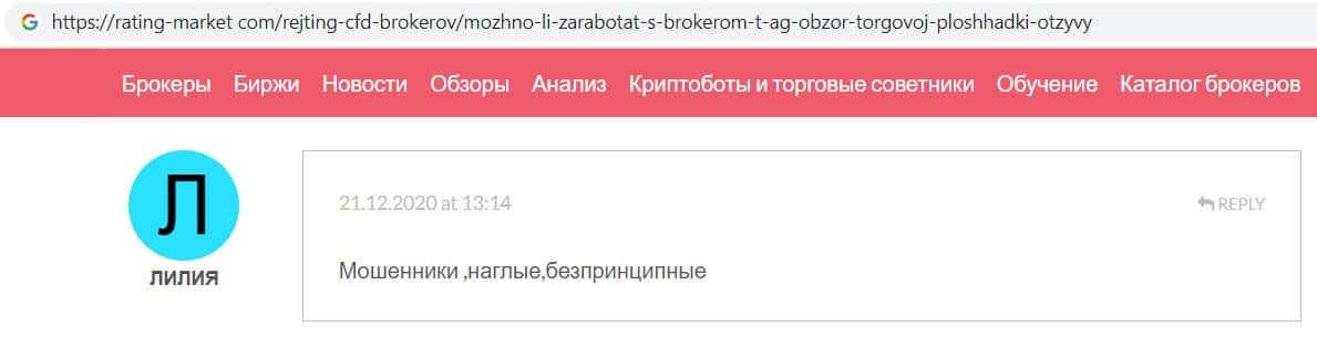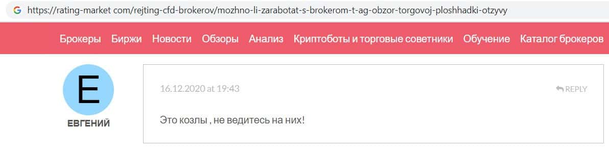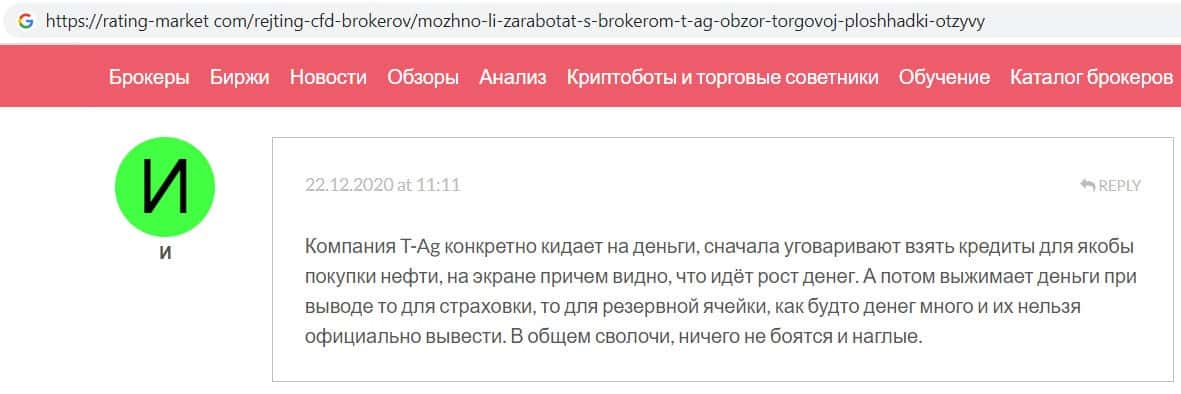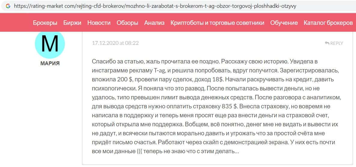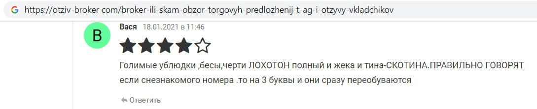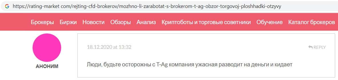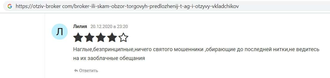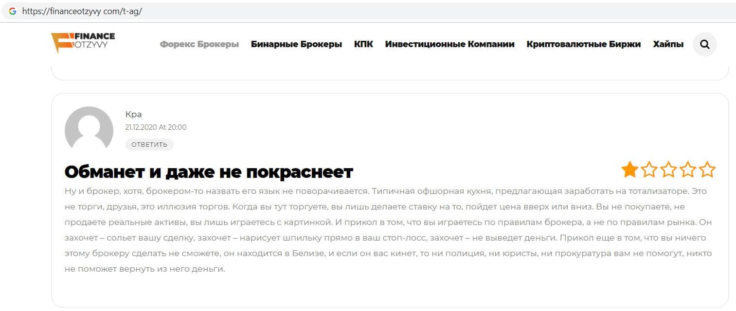 В поисках информации о Т АГ мы наткнулись на сайт bezobmana24 com, который указал, что данная контора не является брокером, а это всего лишь мошеннический проект.