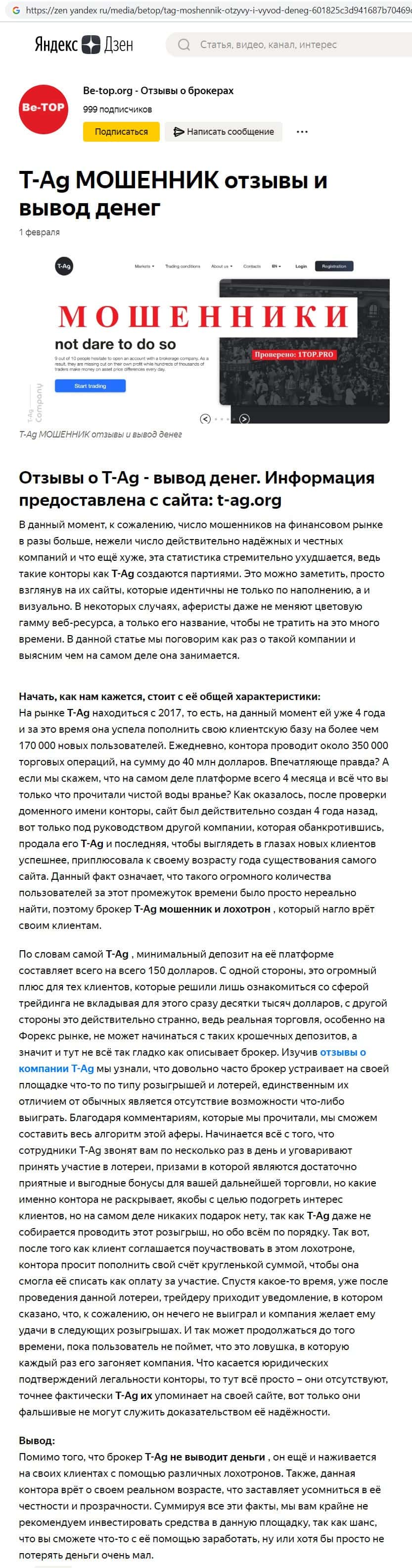 Мы обнаружили статью о махинаторах Т АГ на сайте zen yandex ru. В данной статье сайт рассказал, что брокер не выводит денежные средства и различными способами выманивает их.