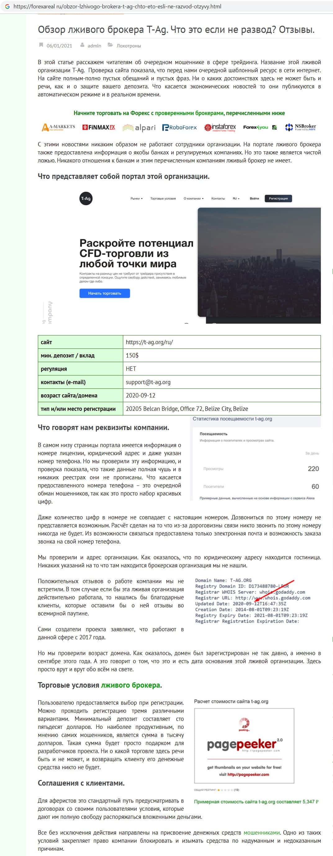 Сайт otziv-broker com опубликовал статью о разводилах T-AG Org, в которой указал, что данная контора является начинающим мошенником, который отбирает деньги клиентов.