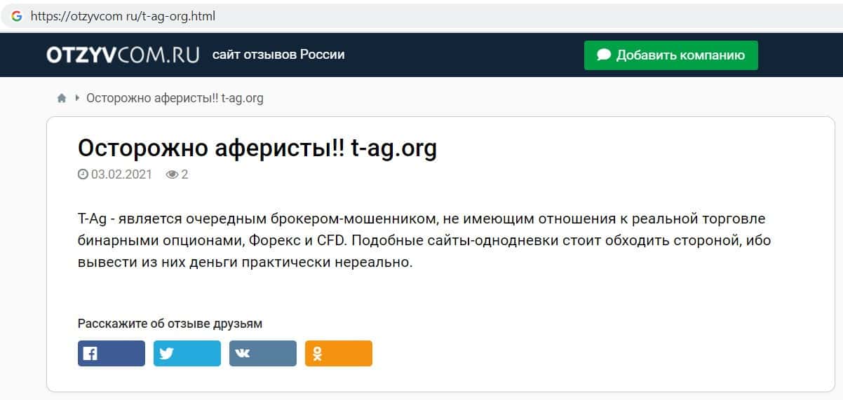 Ещё интернет ресурс infoscam ru назвал компанию T-AG Org наглым мошенником, так как фирма без сожалений отбирает денежные средства клиентов и кладёт в свой карман.