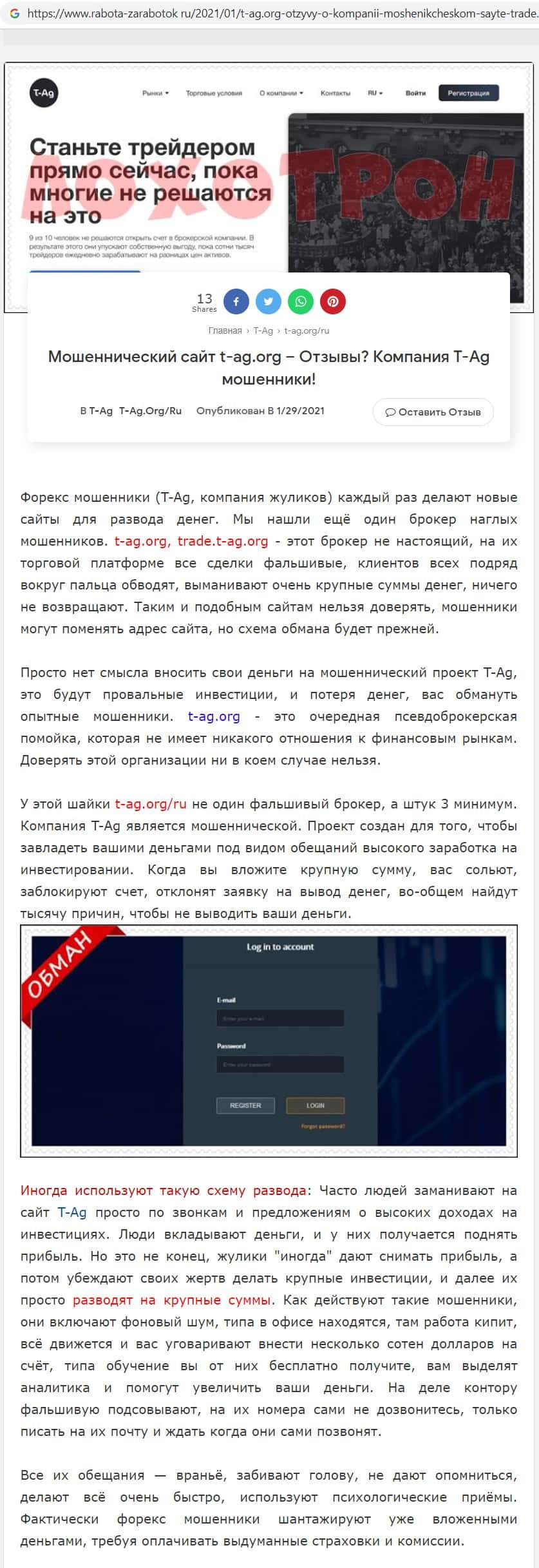 Ещё сайт rabota-zarabotok ru опубликовал статью, в которой рассказал, что контора мошенников T-AG Org обманывает своих клиентов, чтобы завладеть их средствами.