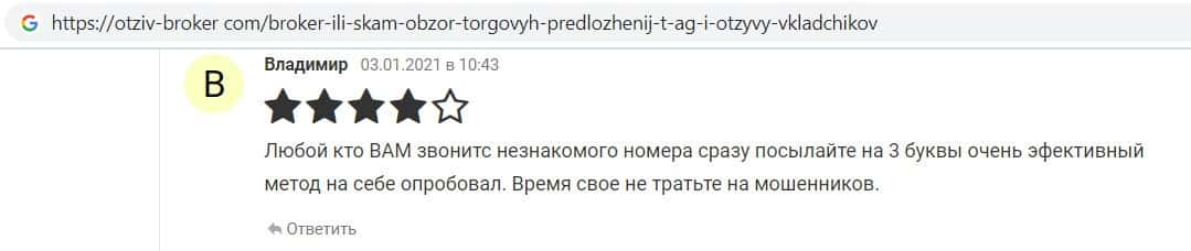 Автор данного отзыва написал, что компания Т АГ является мошеннической, и сотрудники фирмы постоянно звонят с разных номеров, и их нужно посылать на три буквы.